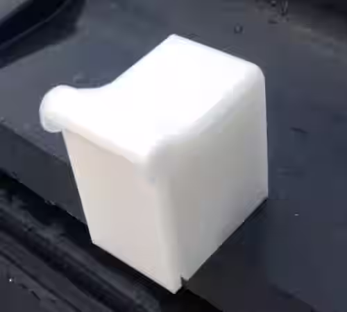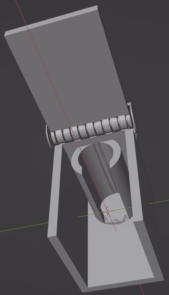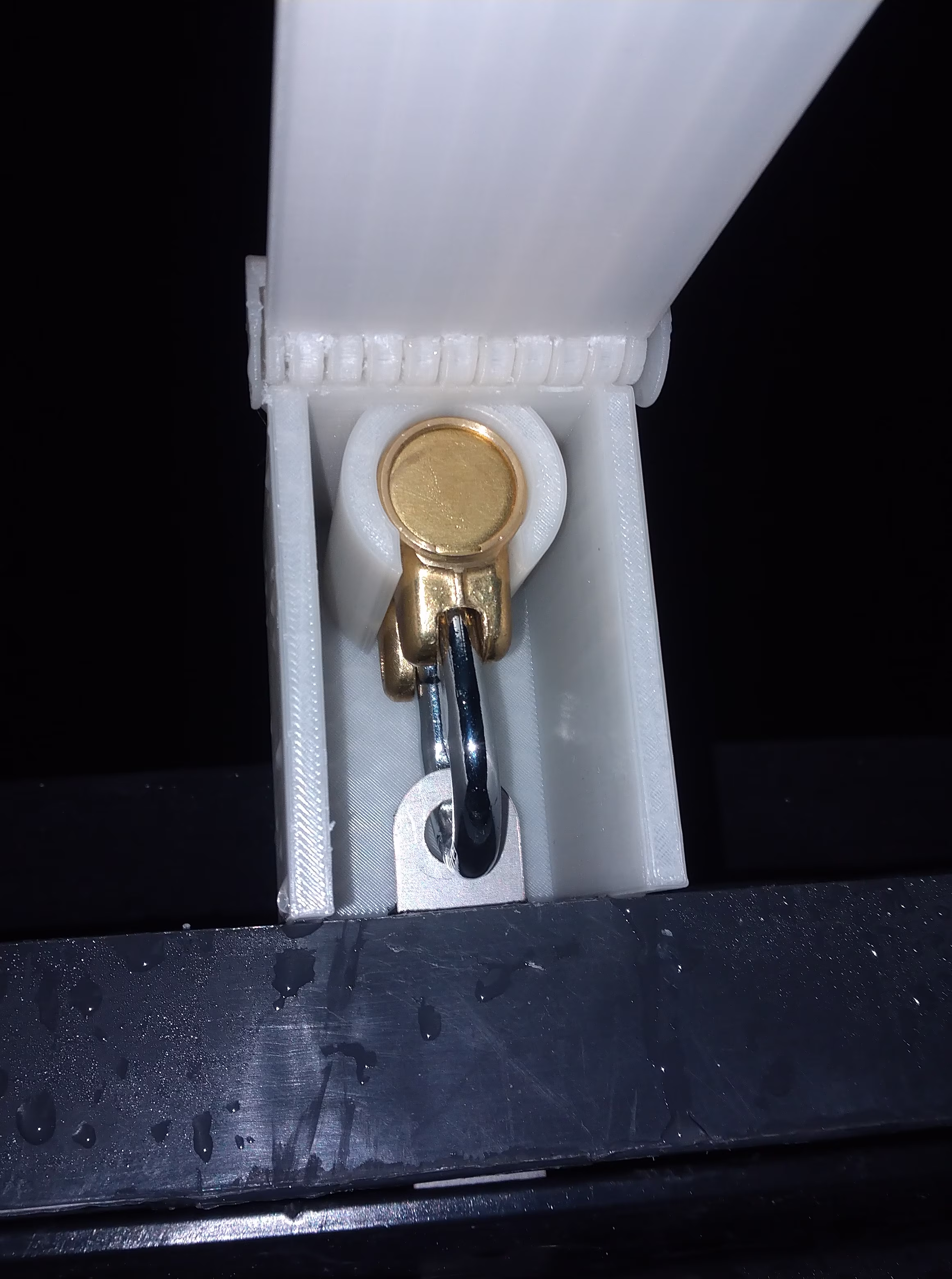 Tällä tavalla tulostettuna läppä tulee liian lähelle koteloon kuuluvia saranalenkkejä ja liimautuu siis niihin kiinni. Irrotin sitä ensin porakoneella 1,5mm terällä. Tämän jälkeen läpän sai kääntymään ja suurimman osan saranan tukirakenteista sai irti puukonterällä kaivamalla.